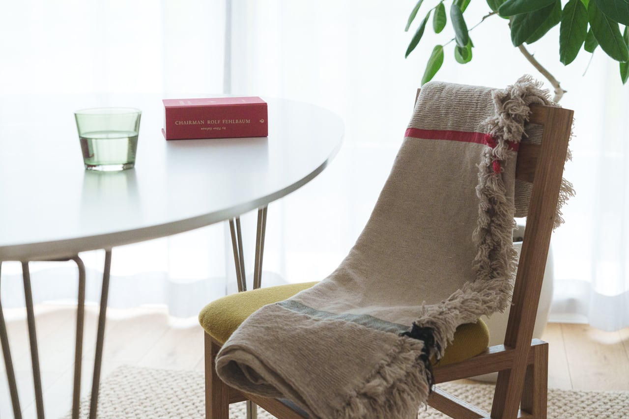 毛布本来の色が混ざったメランジの糸に、赤・黒の緯糸でアクセントを加えたテキスタイルは、多様なインテリアに馴染みます。